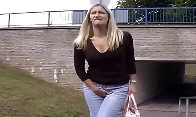 Pale buxom blondie pisses and then sucks a dick on the river bank